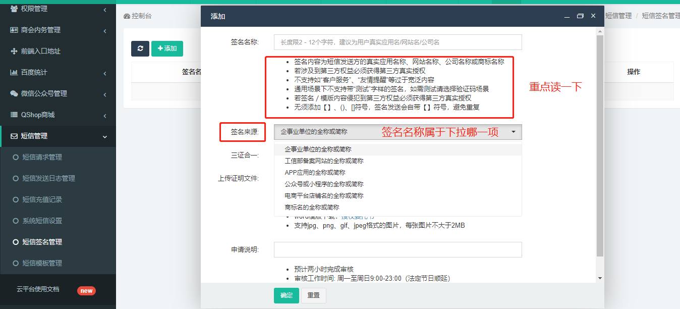 步骤:【营销推广管理】-【短信管理】-【短信签名管理】-【添加】