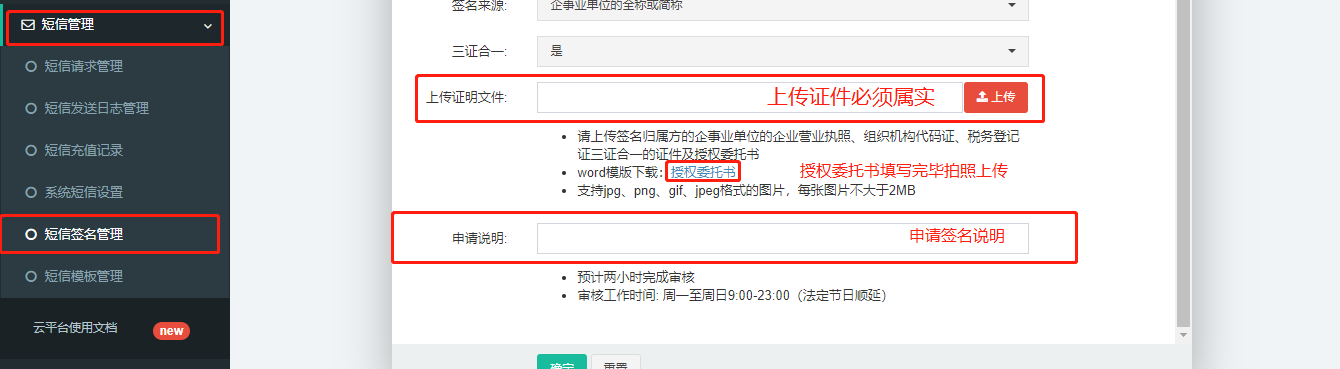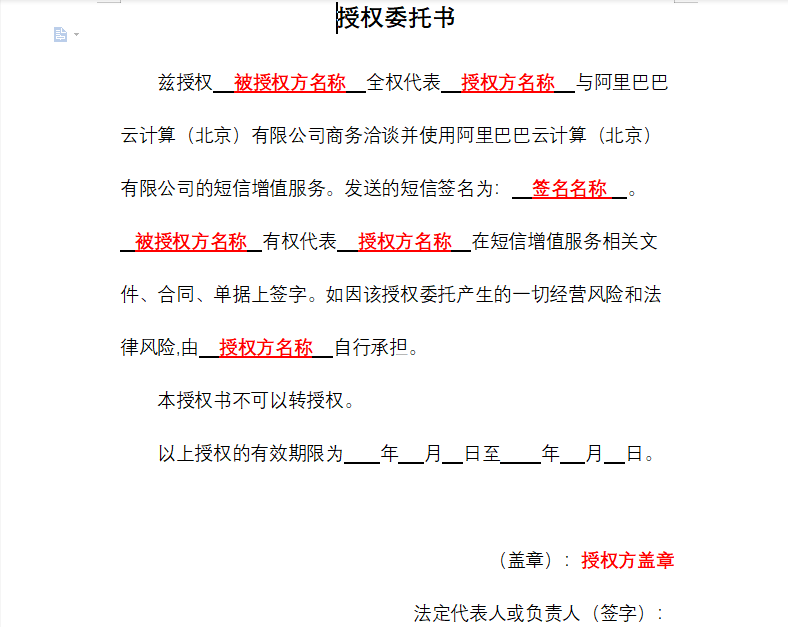 - 短信服务提供授权委托书的Word模板,请在申请页面单击下载模板。