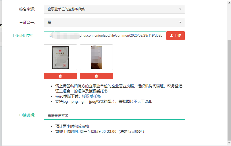 - 如果涉及第三方权益,还需要上传授权委托书。短信服务提供授权委托书的Word模板,请在申请页面单击下载模板。