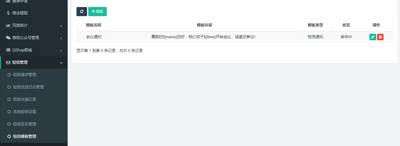 系统默认签名为【中科趣商会】使用模板发送时请设置商会签名,便于接收会员可以更好辨别短信来源。