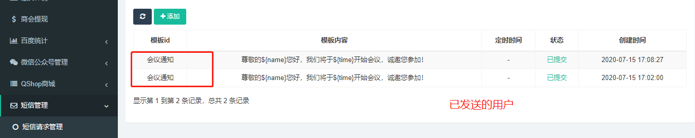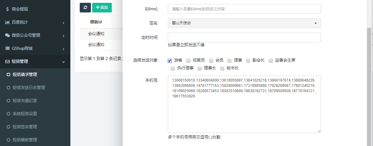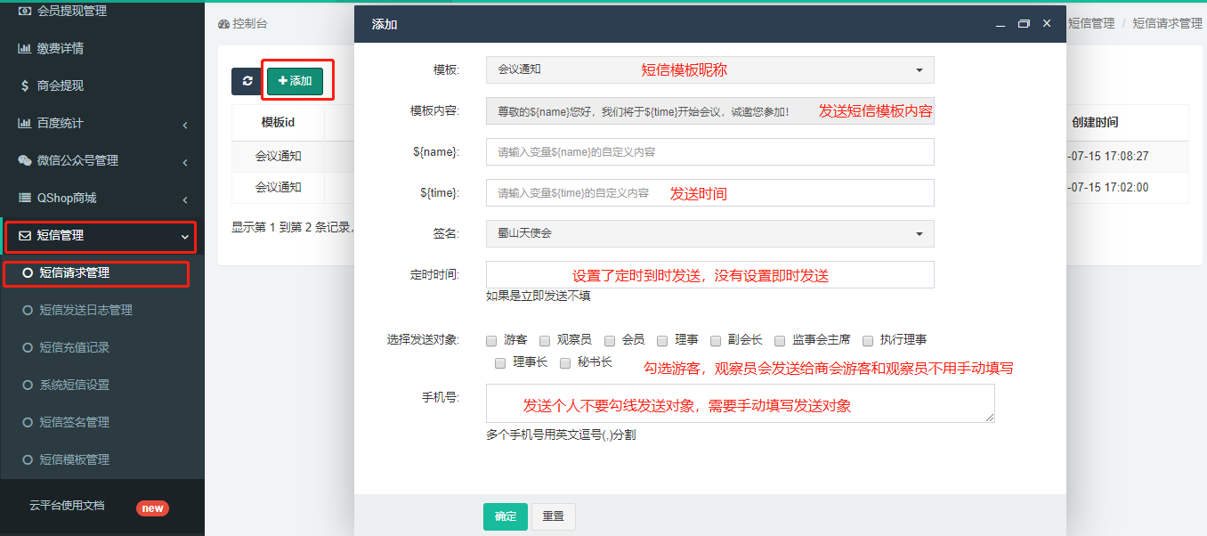 步骤:【营销推广管理】-【短信管理】-【短信请求管理】-【添加】 ${name}在短信模板设置的是${name}发送短信是需要手动添加发送用户名称,否则发送短信名称为空 手机号:勾选了游客会自动展示商会职务属于游客的手机号