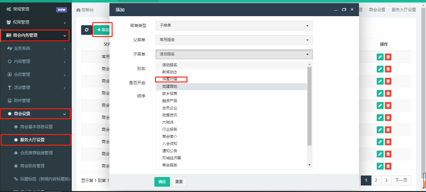 开启供需对接操作步骤:【商会内务管理】-【商会设置】-【服务大厅设置】-【添加】-【子模块】-【供需对接】确定后显示在移动端[首页]