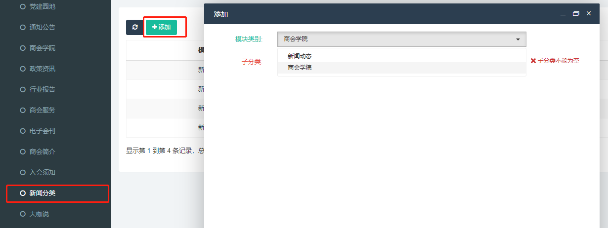 步骤:【商会内务管理】-【内容管理】-【新闻分类】-【添加】