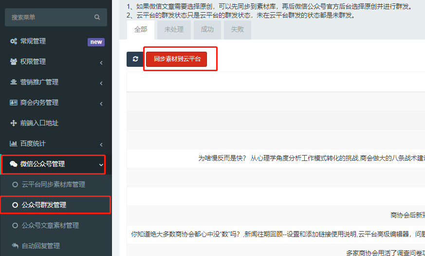 【微信公众号管理】-【公众号群发管理】-【同步素材到云平台】