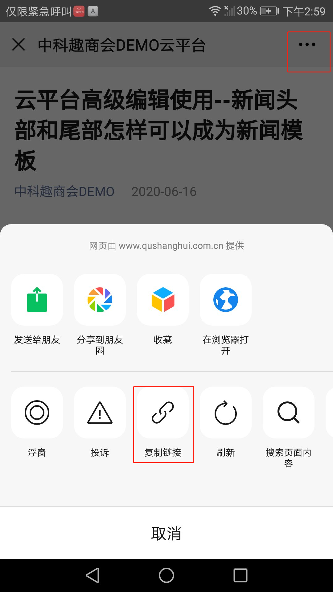 也可以跳转某一篇新闻,在手机端打开您要跳转的新闻,点击右上角三个点点选择复制链接,发给一个朋友,再次复制链接,复制到云平台后台,