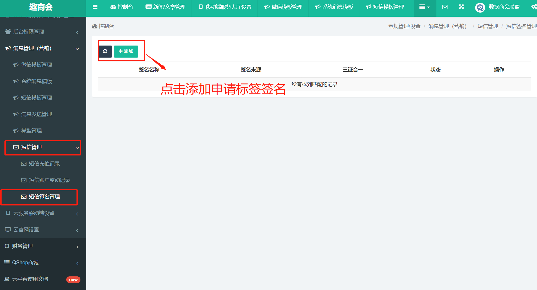 【常规管理/设置】——【消息管理/营销】——【短信管理】——【短信签名管理】——【添加】