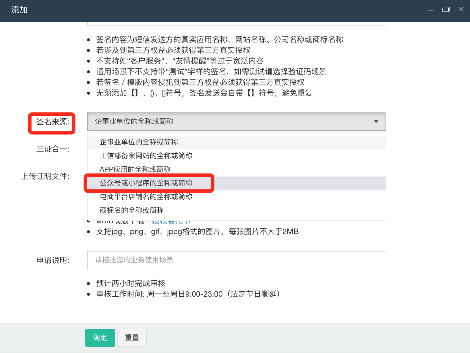 申请注意事项: 1.在申请之前务必咨询申请要求按要求上传文件,如遇申请签名和公司营业执照不一样可在选择【签名类型】时选择小程序或微信公众号