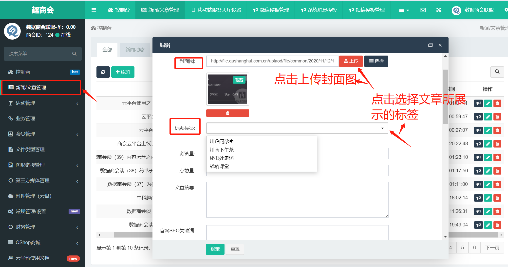 1.当我们申请完成签名以后我们可以在【新闻/文章管理】里面点击【添加】功能,在编辑文章的同时可以选择发布时需要展现的标签内容,如果不需要展示点击标签界面×号即可不展示签名。