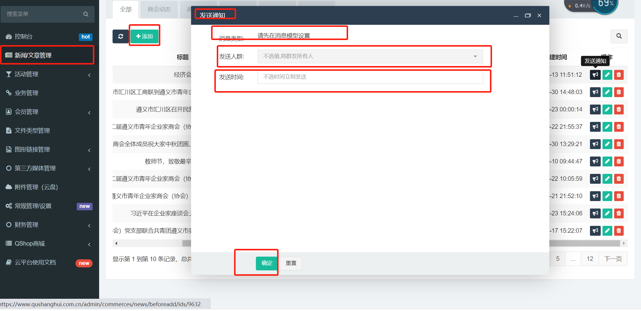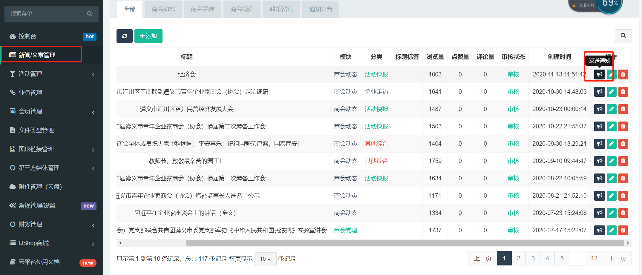 先点击【新闻文章管理】-【添加】-进行编辑文章,编辑完成之后我们可以在该篇文章后面看到一个小喇叭的图标(名称)【发送通知】