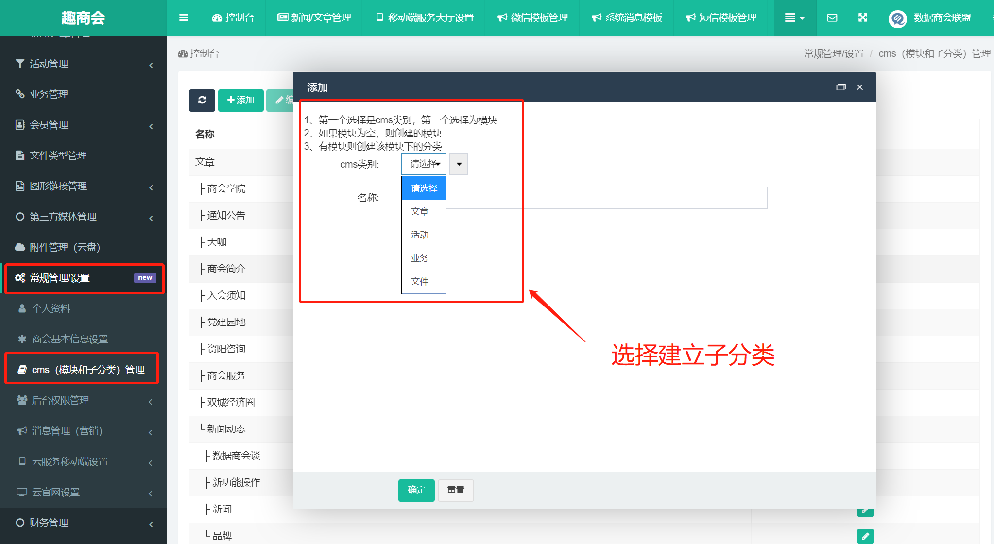 步骤:【常规设置/管理】-【cms(模块和子分类)管理】-【添加】