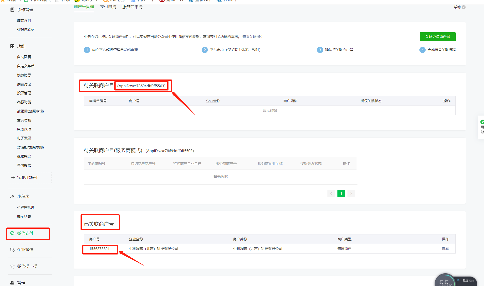 第一步: 我们如果需要在云平台后台绑定自己的微信支付账户,我们需要先申请一个【微信服务号】,然后在【公众号后台】找到【微信支付】按步骤进行开通,详细操作步骤请点击链接进行查看:点我查看教程建议大家在申请好微信支付之后进行下测试看下是否可以正常使用。