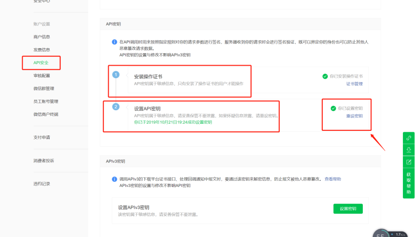 3.登录链接:点我进入微信商户页面扫码进入【微信商户支付平台】找到【API安全】【重置密钥】将重置好的密钥复制到云平台【支付配置】最后一个填选项。