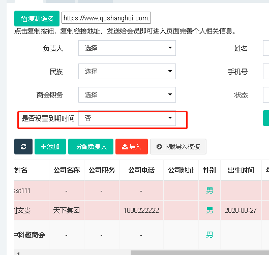 以上是云平台支付配置操作步骤及方法,下面我们来讲一下在开通支付配置之前如何设定会员职务和收费标准,设定会员的会费到期时间。 注意:我们在查看没有设置会费到期时间的用户的时候可以使用【条件筛选功能】进行快速筛选查找哦!