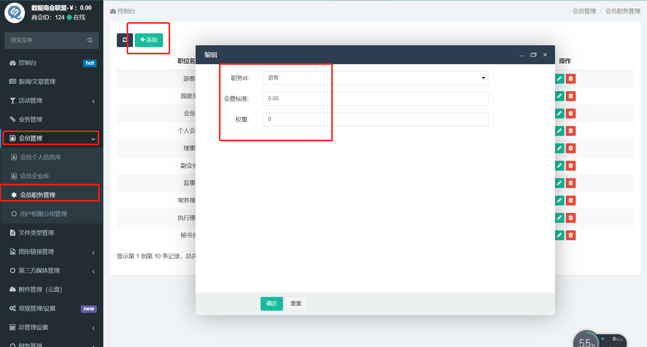 1.打开云平台后台找到【会员管理】—【会员职务管理】—【添加】设置【会员职务】和对应职务的【会费标准】