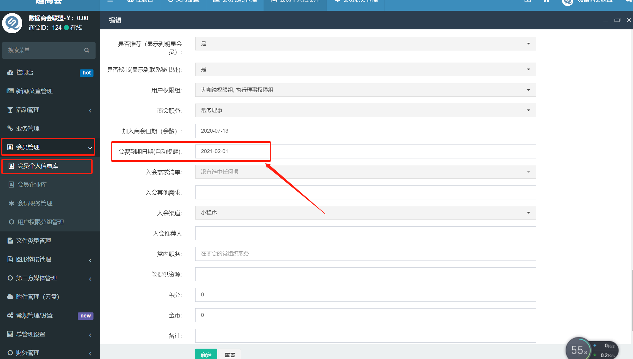 2.我们需要打开【会员管理】—【会员个人信息库】选择或添加你需要更改的会员会费到期时间双击打开会员信息下拉找到【会费到期日期】选项进行设置即可