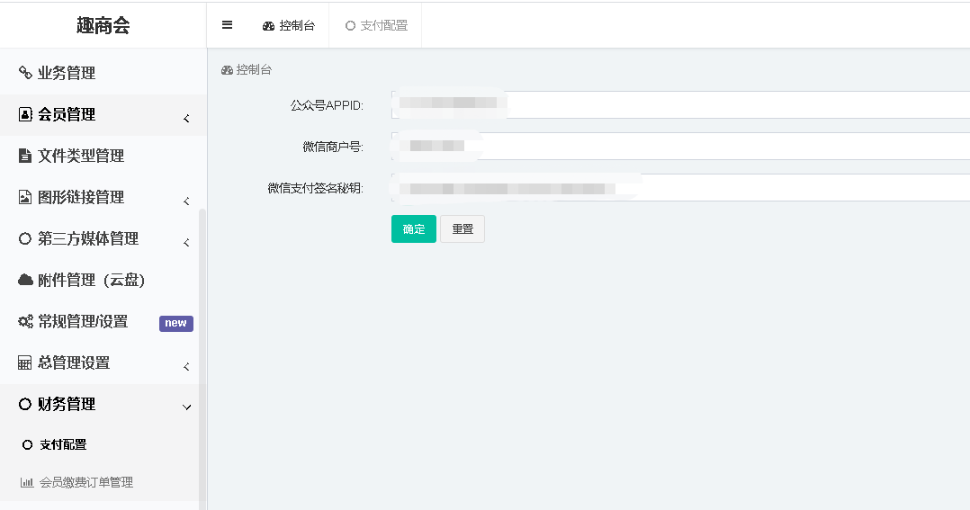 2.复制到【云平台】后台【财务管理】-【支付配置】将刚刚复制的两项按提示放入后台