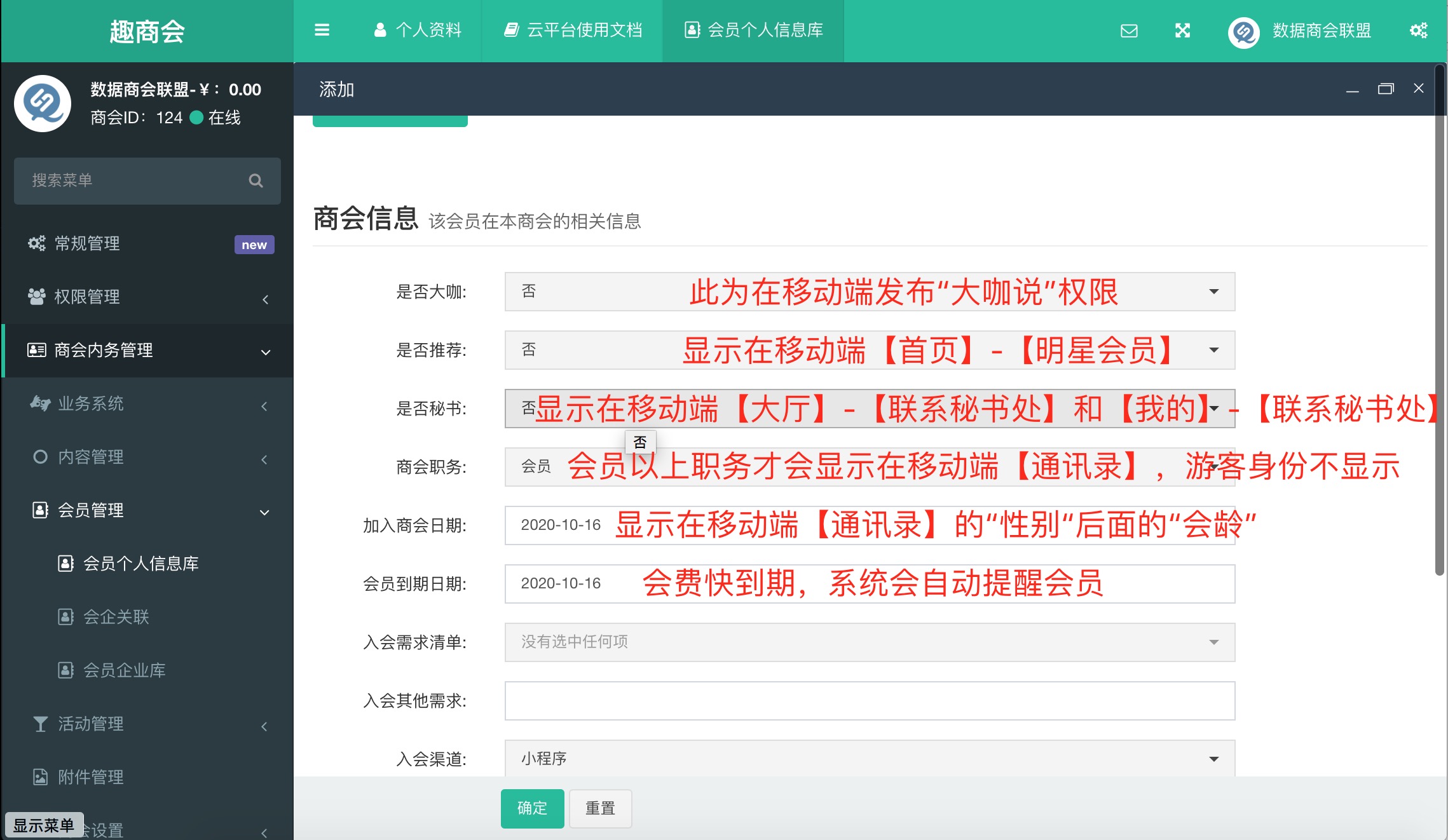 商会信息: 该会员在本商会的相关信息设置。