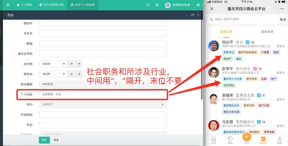 个人标签: 会显示在移动端【通讯录】个人信息下方,建议填社会职务、分会职务、涉及行业等方面信息,标签之间用