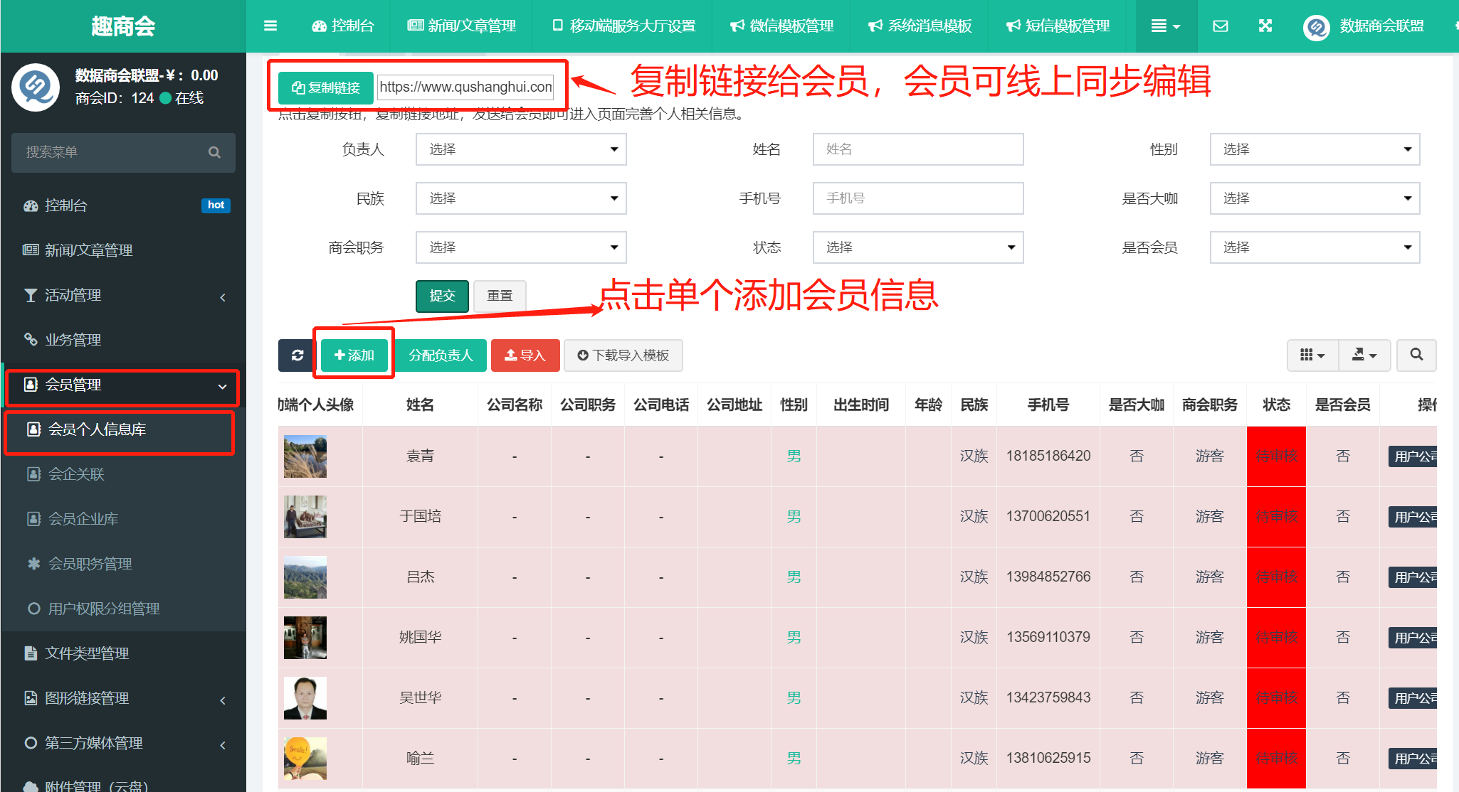 按钮复制链接,将链接发给会员,会员通过点击链接可以在线自行进行编辑个人信息和企业信息。