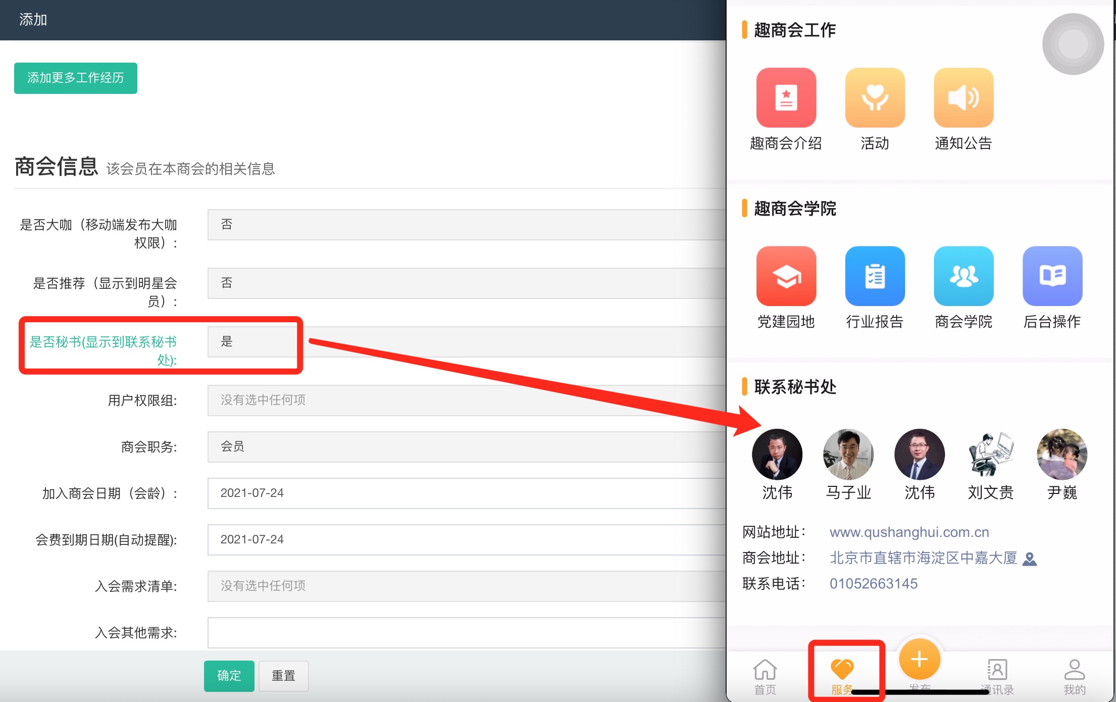 是否秘书: 显示在移动端,大厅联系秘书处和我的。联系秘书处。