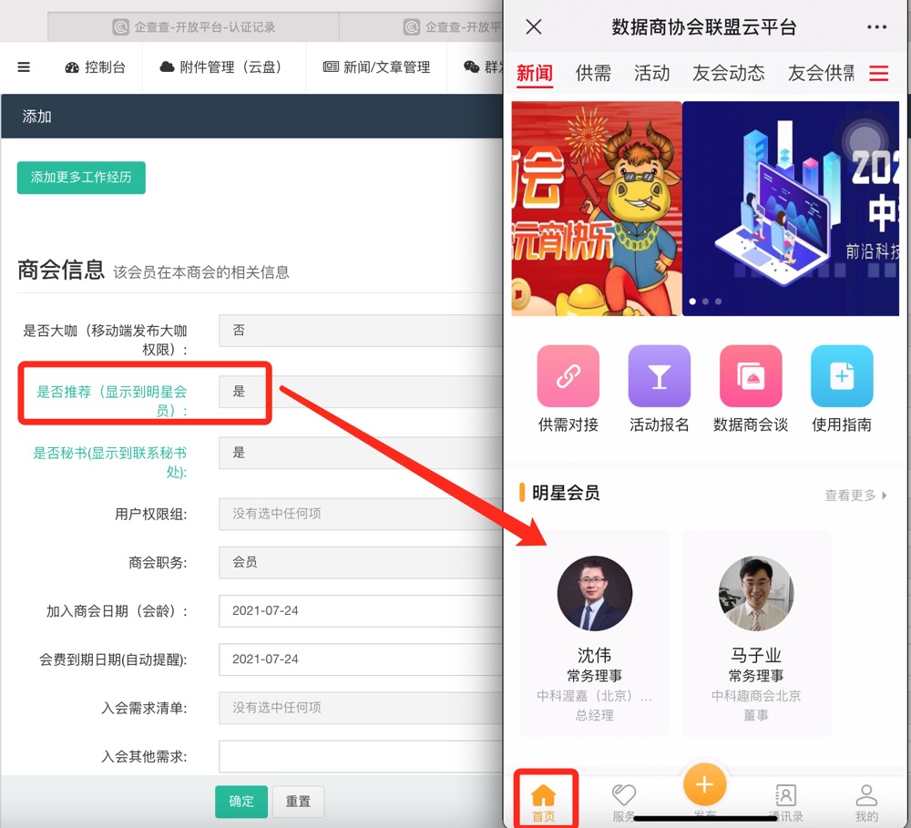 是否推荐: 选择“是”,会显示在移动端首页服务明星会员。
