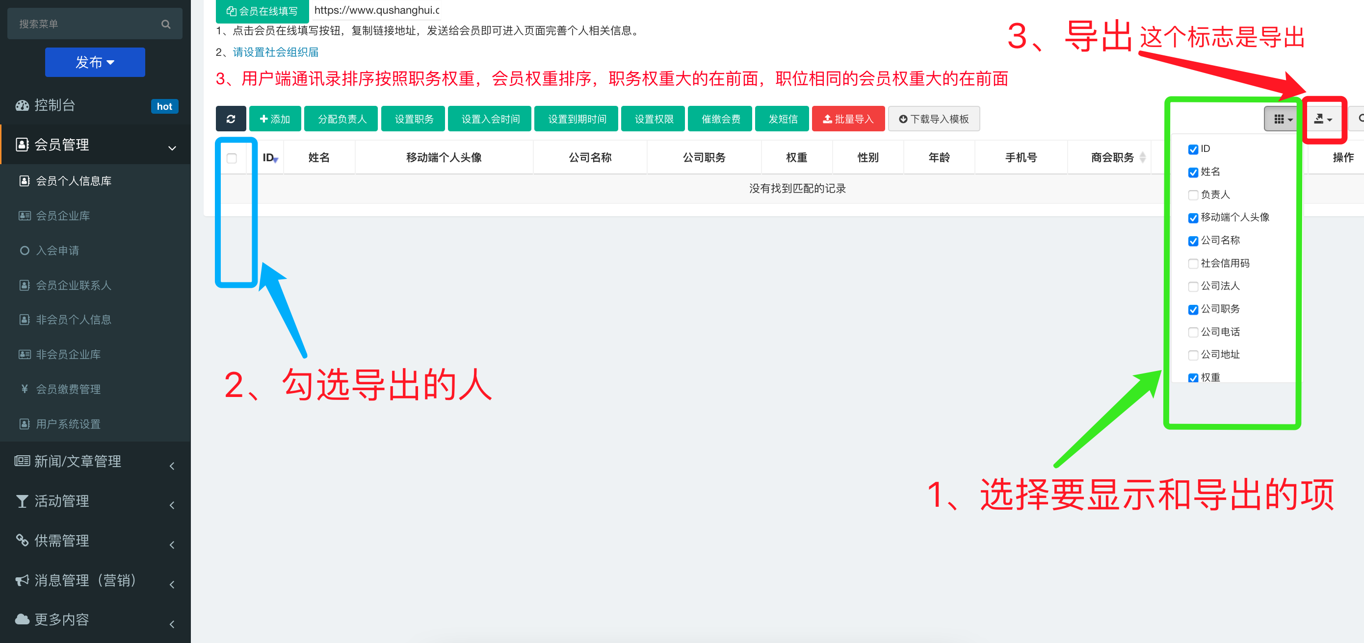 该功能主要是作为活动邀请会员时使用。可以把会员分配给秘书处的同事,一人负责联系一部分会员,方便活动邀约和自动汇总报名情况,下载打印签到表。 具体操作步骤: