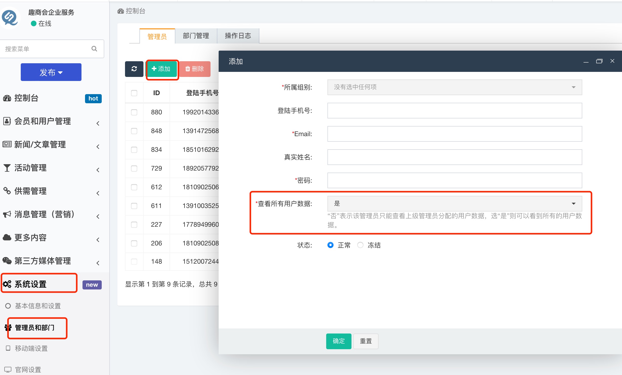 选中数据签名的方框,再点击【分配负责人】把数据分配给某个管理员。如果该管理员在【管理员】设置里,【是否查看所有用户数据】选的“否”,此时,该管理员只能看到分配的数据。
