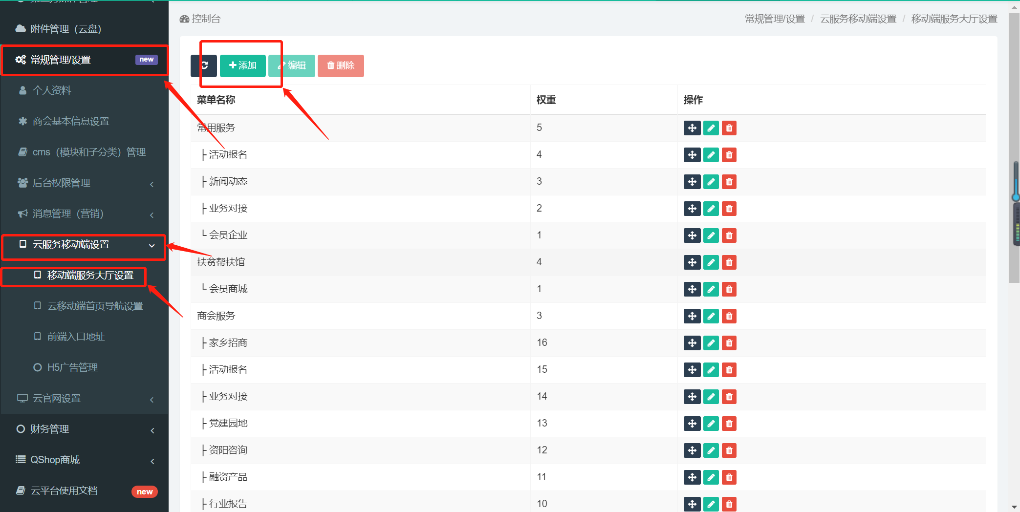 步骤:【常规管理/设置】-【云服务移动端设置】-【移动端服务大厅设置】-【添加】,权重越大展示越靠后