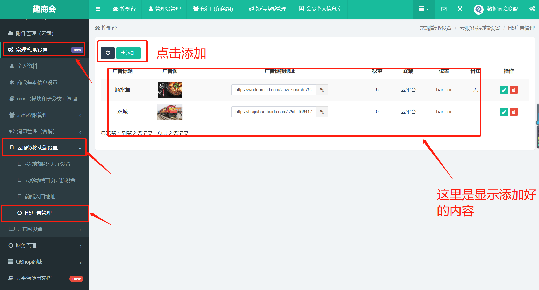 步骤:【常规管理设置】-【云服务移动端设置】-【H5广告管理】-【添加】