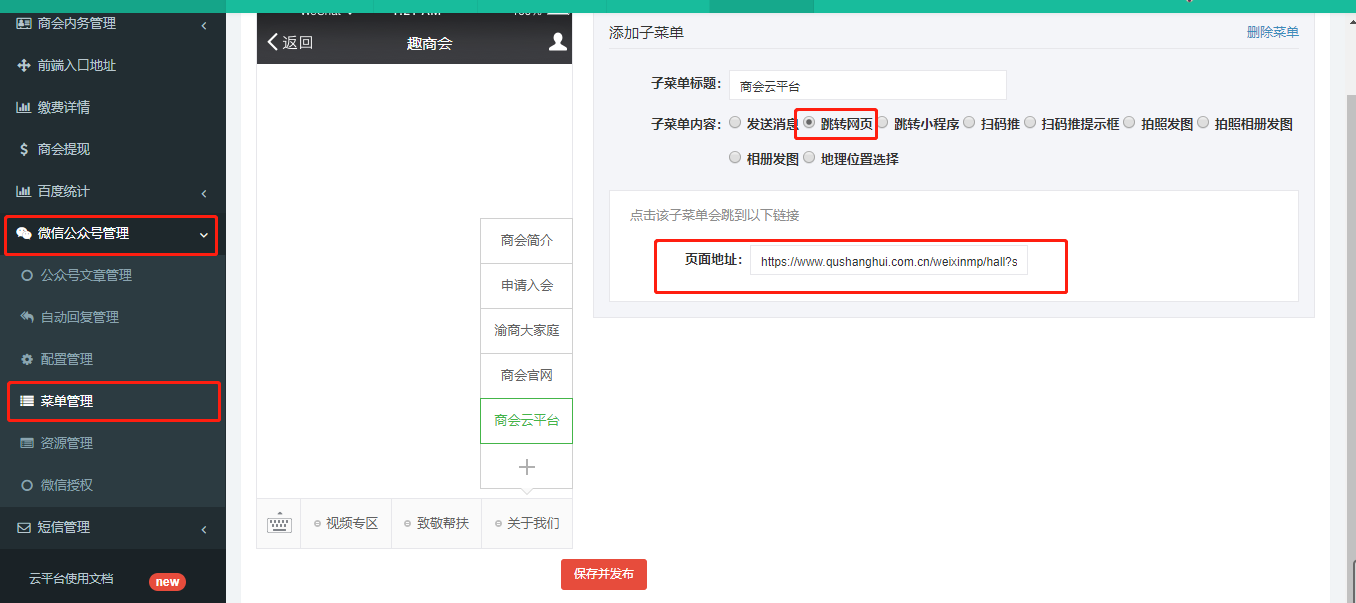 和微信公众号后台设置相同。 点击菜单,点击“+”号新增子菜单,或者点击修改现有子菜单,一个菜单可以添加最多五个子菜单, 【菜单标题】自定义填写, 【子菜单内容】选择“跳转页面”, 【页面地址】表示用户点击跳转的页面地址。黏贴链接地址,复制过来。如图: