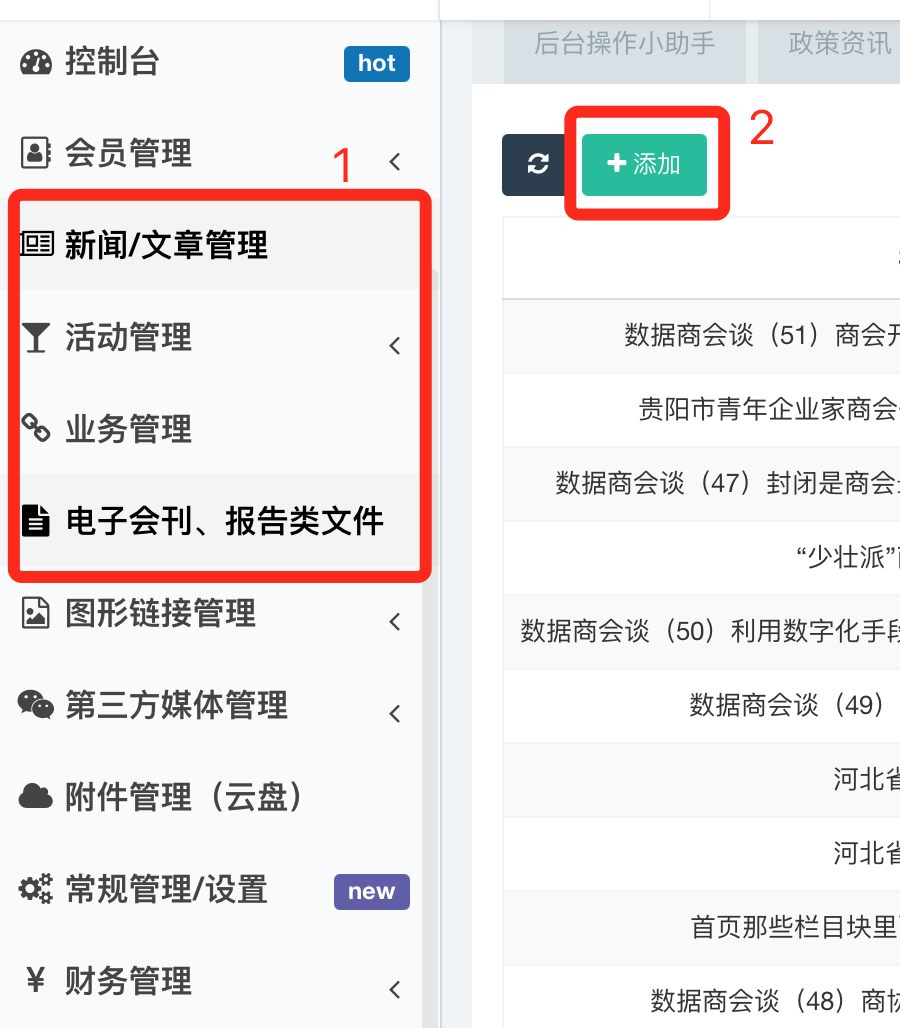新闻、活动、供需、文件四种类型的发布入口有3个,分别是: