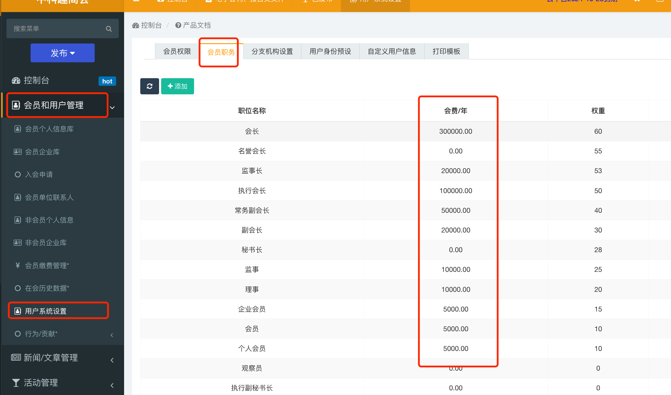 设置每个职务对应的会费:
