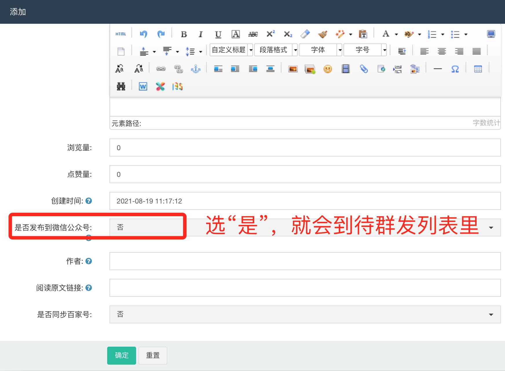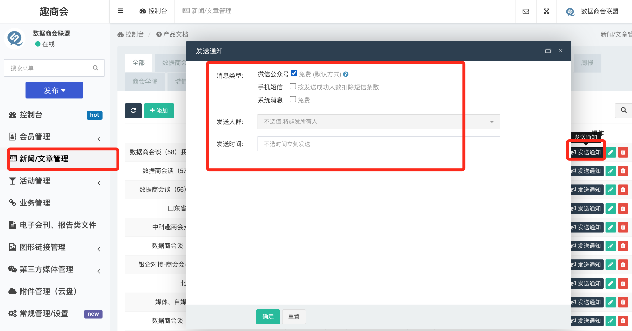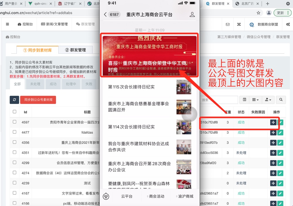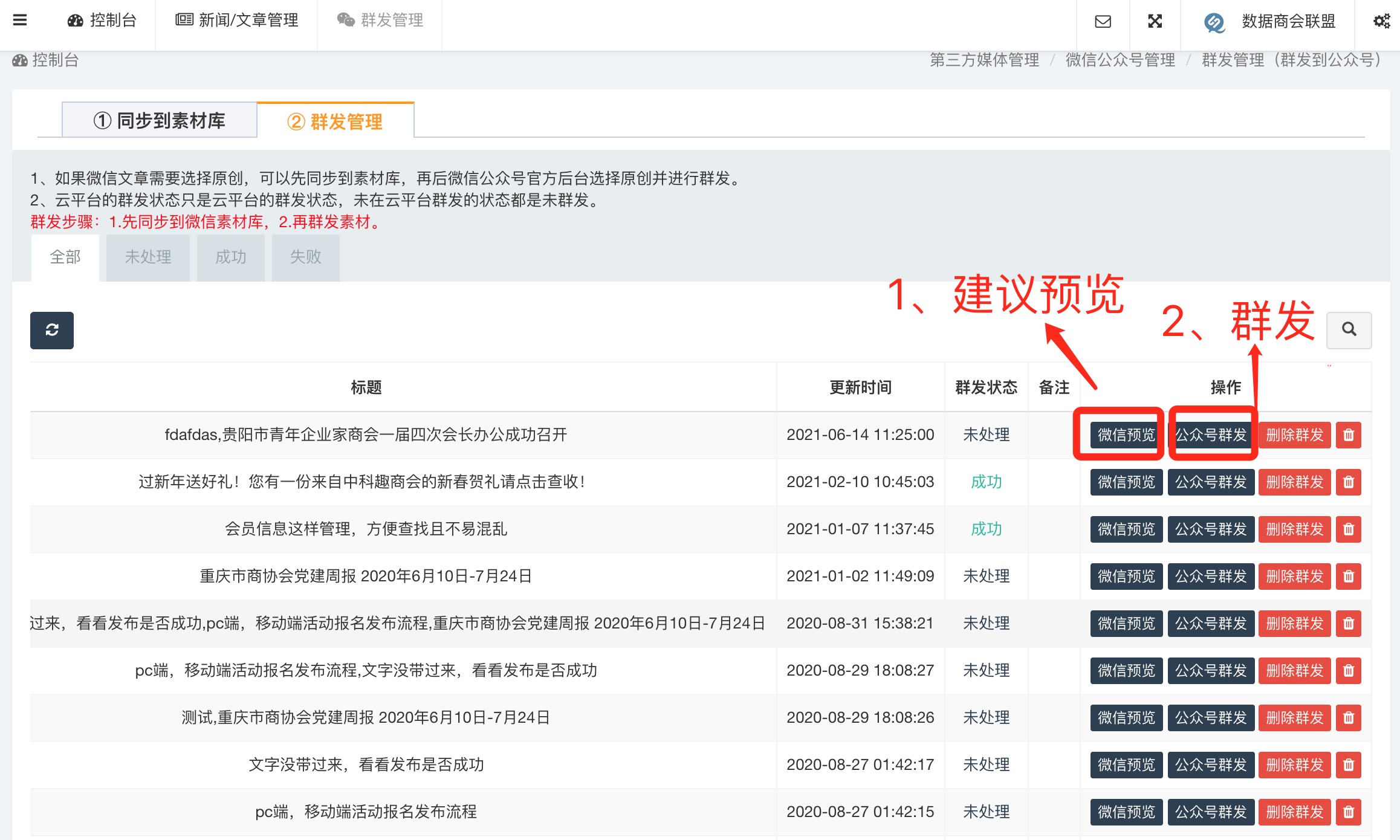 1、【新闻/文章管理】,点击新闻文章管理,在创建文章时设定【是否同步公众号时】,选择【是】,该新闻就会同步到本【群发管理】页面。