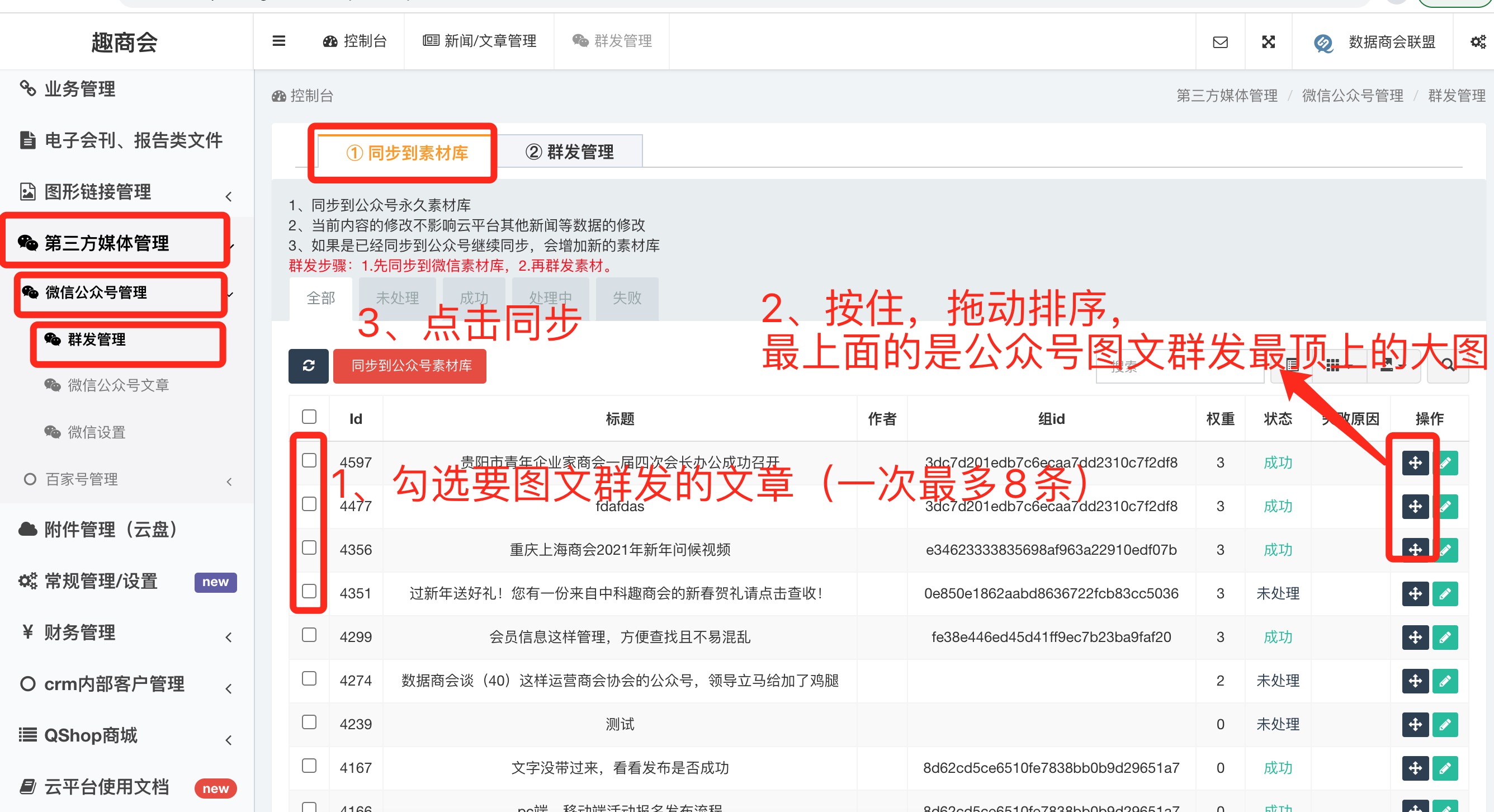 2、勾选待群发内容,确认排序(可按住图标上下拖动排序),点击“同步到公众号素材库”。