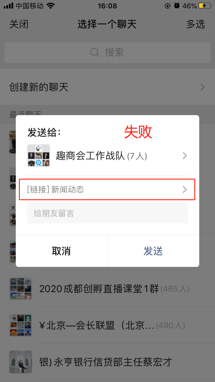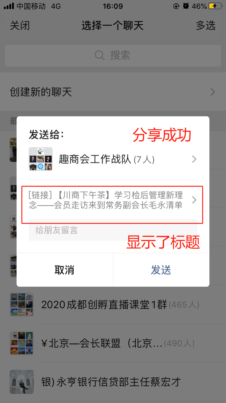 2.当点击分享发送给朋友的时候,有标题有注释文字表示成功