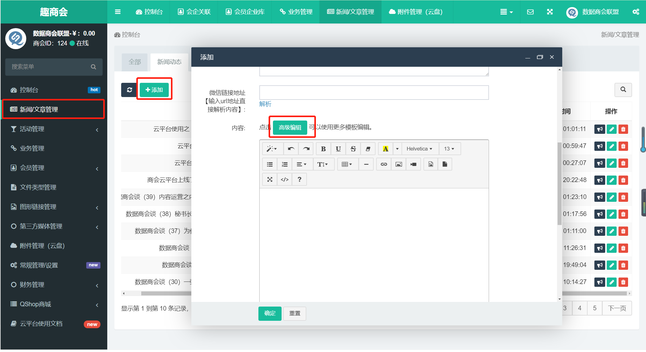 目录 搜索 一、新功能发布记录二、开篇:搭建和使用任务清单三、管理后台使用指南(按页面)(一) 控制台(二)会员管理系统2.1 会员个人信息库2.2 会员企业库2.3 会员单位联系人2.4 入会申请2.5 非会员个人信息2.6 非会员企业库2.7 会费管理在线缴/交会费的操作2.8 在会历史数据2.9 用户系统设置2.9.1 用户权限2.9.2 职务与会费标准2.9.3 会员类型2.10 分支机构2.11 行为/贡献2.12 积分管理(三)新闻/文章管理3.1 已发布高级编辑插入图片\选择图片使用图文模板新闻头部和尾部怎样添加进高级编辑模板里插入PDF、WORD、EXCEL文档发布页面介绍(新闻类)插入视频3.2 待审核3.3 草稿/撤回(四)活动管理4.1、活动发布和常规使用报名和签到管理4.2、草稿/撤回4.3、抽奖系统4.4、活动类型4.5、酒店客房管理4.6、报名表增项4.7 高级(五)供需管理(六)消息管理(营销)6.1. 消息发送管理6.2. 应用场景模版管理6.3. 短信管理(七)更多内容(七.2)电子会刊/报告类文件(七.1)图形链接管理(LOGO墙)7.1 链接管理7.2 设置图形链接分类(七.3)附件管理(云盘)(八)第三方媒体管理8.1. 微信群发管理8.2. 微信公众号文章8.3. 微信设置自定义菜单链接地址微信公众号自定义菜单怎样设置微信公众号入口地址(九)系统设置个人资料9.1. 商会基本和设置9.5 支付配置9.3. cms(模块和子分类)管理9.2. 管理员和部门10.4.1. 管理员10.4.2. 设置管理后台的部门和权限9.3. 移动端设置10.6.1. 用户端服务大厅设置广告设置9.4. 云官网设置9.7.1 站点设置9.7.2 官网导航/菜单设置9.7.3 官网广告管理9.7.4 官网友情链接设置友情链接管理友情链接组管理焦点文章云上党建9.5 官网模版设置9.6 账号管家(十)服务预约系统商家服务商家管理视频管理(十一)自定义表单22.退出登录添加秘书处人员和设置联系秘书处四、管理后台使用常见问题9.内容标题标签设置和标签签名申请9.1.申请标签签名步骤9.2内容标题标签设置1.明星会员相同职务的排序2.登录个人账号没有某一个权限怎么办,例如业务系统3.给新闻分类,选择分类显示数字4.用户端看到的文章里图片靠右,或者调整图片所有位置和大小5.子人员忘记密码怎么修改密码6.供需和新闻如何在后台不删除,移动端不显示,7.明星会员怎么添加8.填写了会员企业库,通讯录会员下面不显示企业信息9.商会学院新闻上传不了?11.高级编辑器加视频在高级编辑器里面添加视频在新闻编辑页面添加视频12.往期回顾使用高级编辑怎么设置13.新闻发布整个流程添加云平台群发微信公众号添加新闻标题标签新闻分类14.后台和移动端发布供需对接查看和使用供需对接查看分享供需收藏供需拨打电话开启供需对接添加供需对接设置供需对接标签查看供需对接15.会企关联自动展示16.商会商城完善说明轮播图导航广告分类展示通告商品分类管理商品添加记量单位管理运费模板管理快递公司管理服务标签管理订单管理移动端我的页面展示商品展示如何选择分类?17.消息管理(营销)签名设置短信模板设置短信请求管理系统短信设置短信发送日志管理短信充值申请签名注意事项18怎样用代码复制微信公众号新闻样式19,新闻群发功能优化新闻管理云平台同步素材库管理公众号群发管理公众号文章素材管理20.高级编辑器保存问题21.会员申请入口在哪里可以找到?22.商会会员如何操作才算同意入会成功?在线催缴会费的几种方式(自动、手动)开启或者关闭自动发送催缴会费消息通知,开启或者关闭自动发送催缴会费消息通知,开启和关闭自动发送的消息通知解析公众号和其它自媒体内容,保持内容和样式不变的操作管理后台综合功能实现五、用户端(移动端)使用说明六、移动端常见问题解答1.商会职务排序,相同商会职务的排序,不同商会职务的排序2.相同商会职务调整排序?3.电子会刊/行业报告和新闻里的文件打开很慢或者打不开?4.添加了会员企业在首页没有展示5.分享失败处理方式1.登录和激活会员身份2.在线填写入会申请3.通讯录4.会员企业5.发布图文信息6.查看/分享新闻7.查看/报名/分享/签到活动发布报名分享签到活动8.联系秘书处-拨打座机和秘书处员工手机9.查看商会地址和导航10.使用商会其它服务和查看内容11.兄弟商会12.搜索新闻、企业、会员等内容13.编辑个人资料14.【我的企业】-编辑企业资料15.使用【我的名片】16.【我的会费】-查看会费到期时间和在线缴会费17.我的笔记18.云平台如何无限次群发公众号消息19.会员信息为什么不能删除?我们如何隐藏会员信息?20.如何将微信公众号添加到桌面快捷操作21.如何将公众号添加到桌面快捷操作第三方平台操作教程开通绑定微信支付功能详细教程02.移动端会员缴纳会费操作流程03.查询云平台会员缴费详情操作指南04.微信商户平台提现操作步骤和到账时间05.微信支付商户费率明细表域名申请和ICP备案公众号历史已群发数据同步操作其它操作-临时域名短链生成 短链接生成公安备案/京公网安备下载网站域名证书查看备案IP地址云平台操作指南(视频)1.云平台新闻发布和高级编辑器使用操作指南2.如何通过云平台群发公众号图文消息3.云平台短信模板申请和发送模板消息操作指南4.云平台设置微信公众号菜单栏操作方法5.云平台上传会员头像操作指南6.云平台会员分组管理和开通会员权限操作指南7.会员职务管理和会费标准设定操作指南8.云平台移动端会员个性