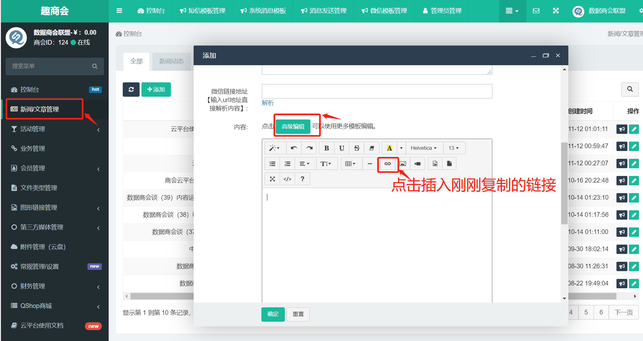 2、【新闻文章管理】-【添加】-【文章编辑器】-【插入链接】在附件链接上传完成以后,将链接插入你所所编辑的文章里面,这样当用户点开嵌入文章里面的连接时,就可以看到相关附件内容。