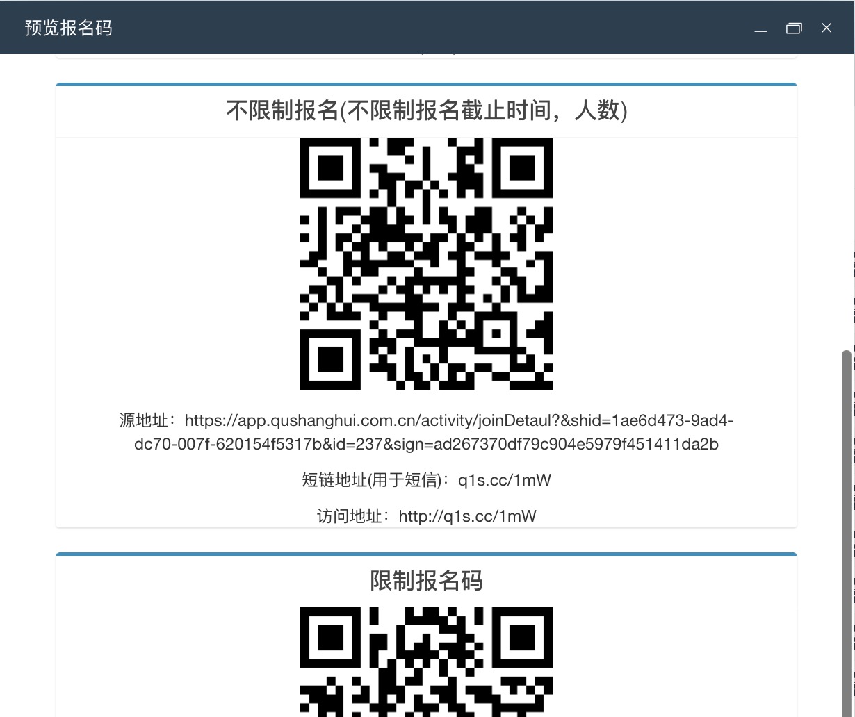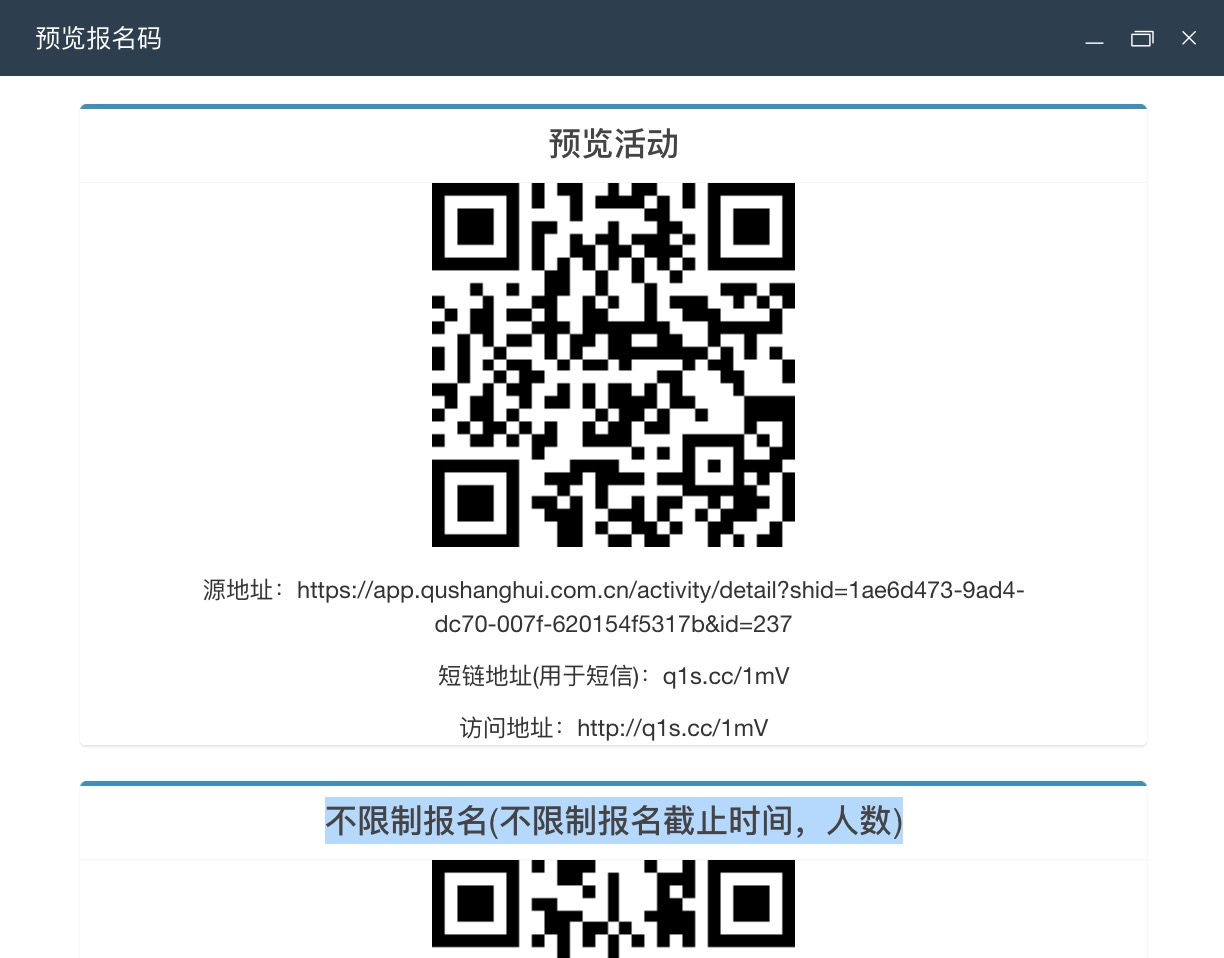不限制报名二维码: 不受参会人权限、人数和报名截止时间的限制,都可报名。主要应用场景:活动开展时有人没有提前报名直接到了现场,公布的活动报名已经受限制无法报名了,这时可以让其扫此不受限制二维码报名。