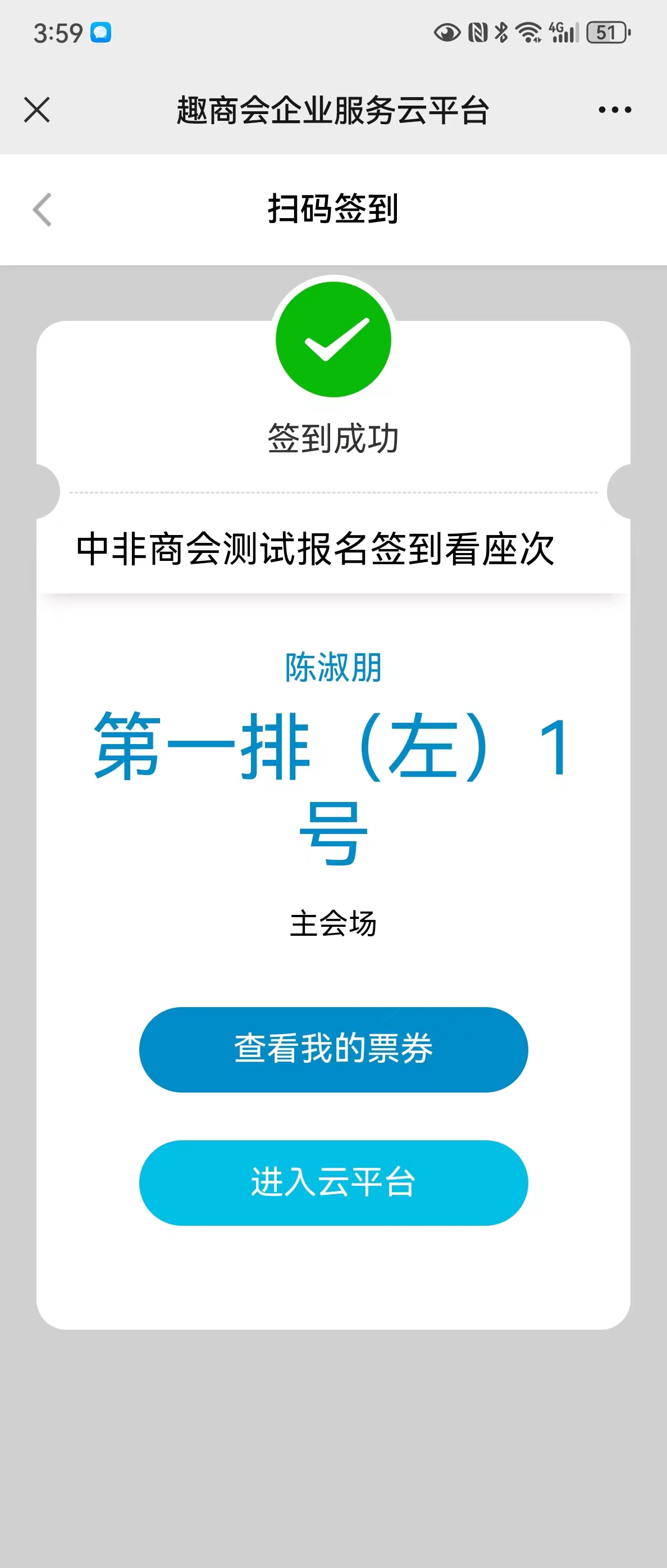 供会议活动现场签到使用的二维码,打印出来放在签到台,让参会人扫码。记录签到,记录到会员的历史行为。如果设置了座次,签到时能看到本人的座位号。