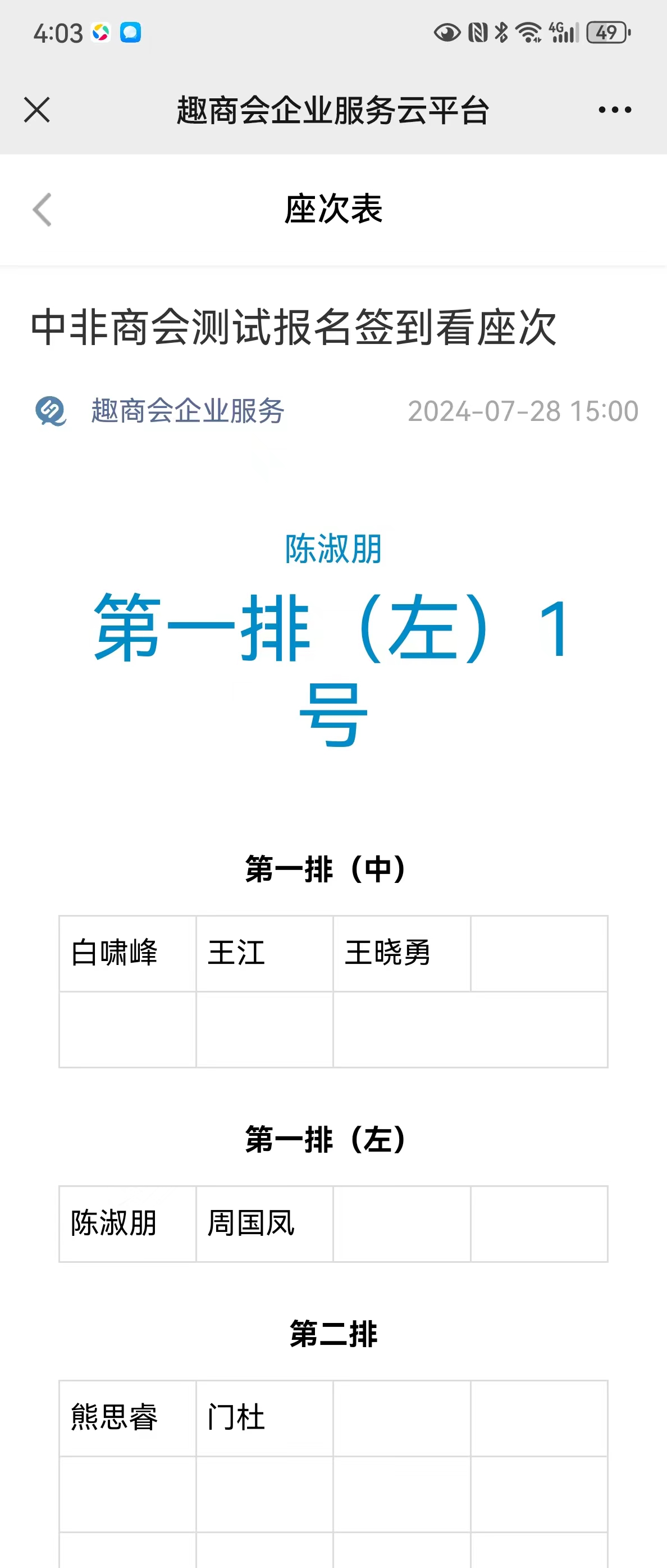 扫描专门的整体座次二维码(位置在座次页面),显示的页面内容,上面显示本人的座位号(只能登录且已经安排了座次才能看到),下面是整体的座次,如图: