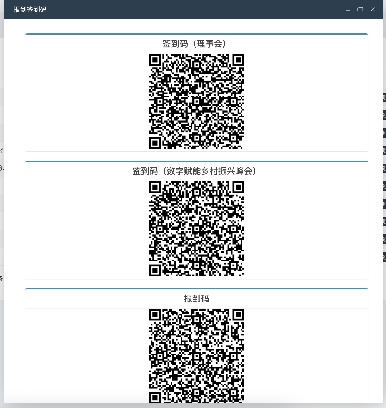 - 会增加“报到二维码”。 如果没有设置会场,则不会有报道二维码。