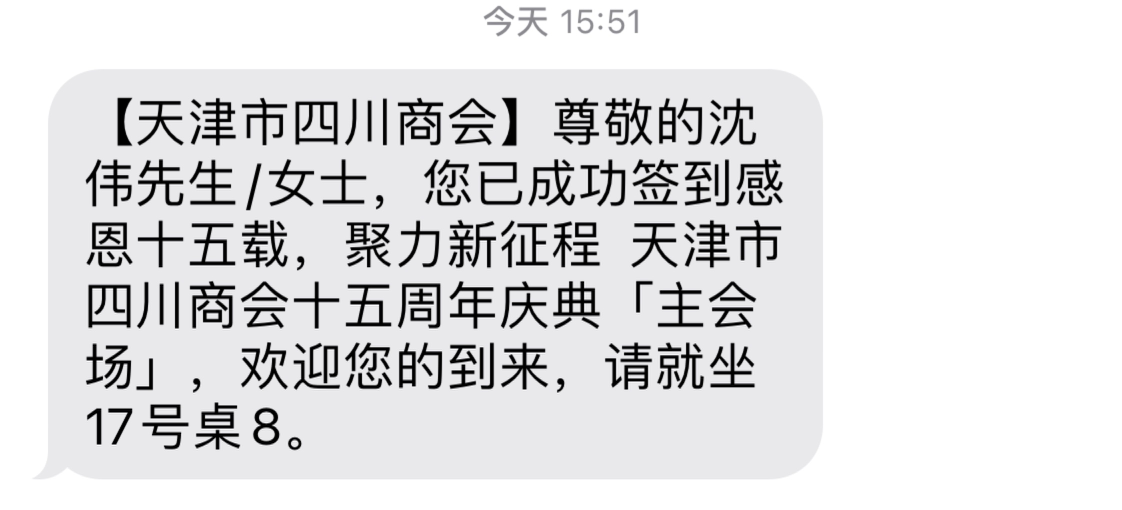 - 签到成功回执: 参会人扫码签到成功后,系统会自动给参会人发送短信,如下图。如果设置了座位短信里会带上,未设置座位则不会有。