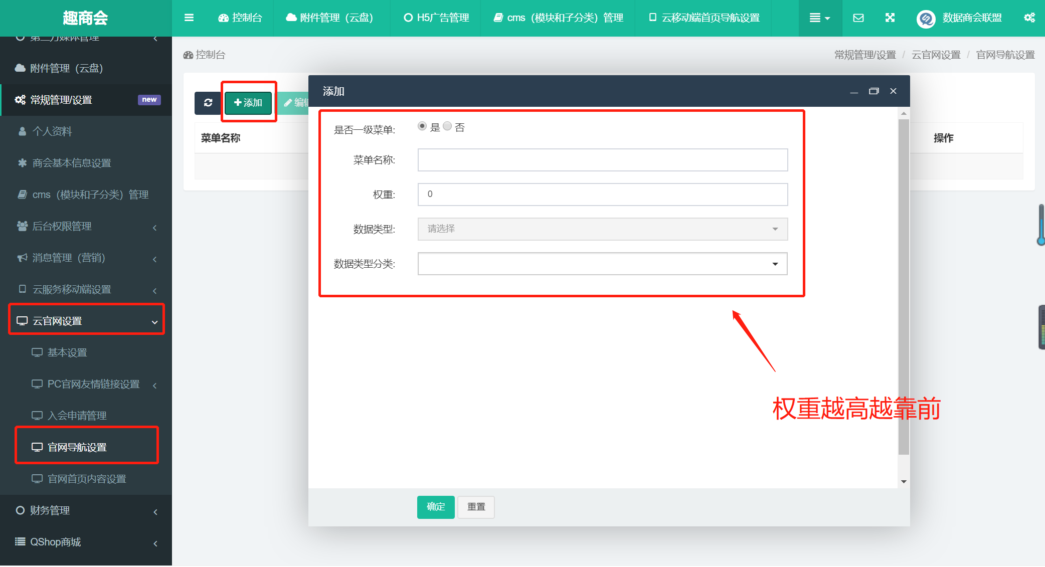 步骤:【云官网设置】-【官网导航设置】-【添加】