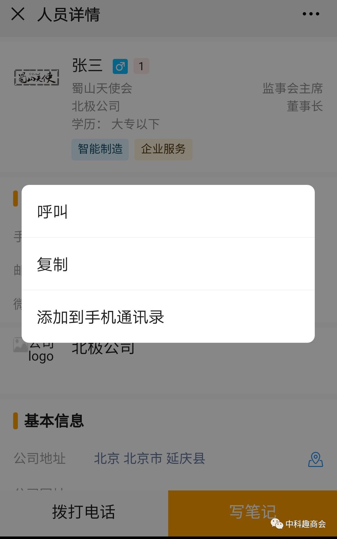 进入详情页看见拨打电话没错这个电话就是可以打给这位会员的, 然后弹出了一个小框,里面有 [呼叫] [复制] [添加到手机通讯录]