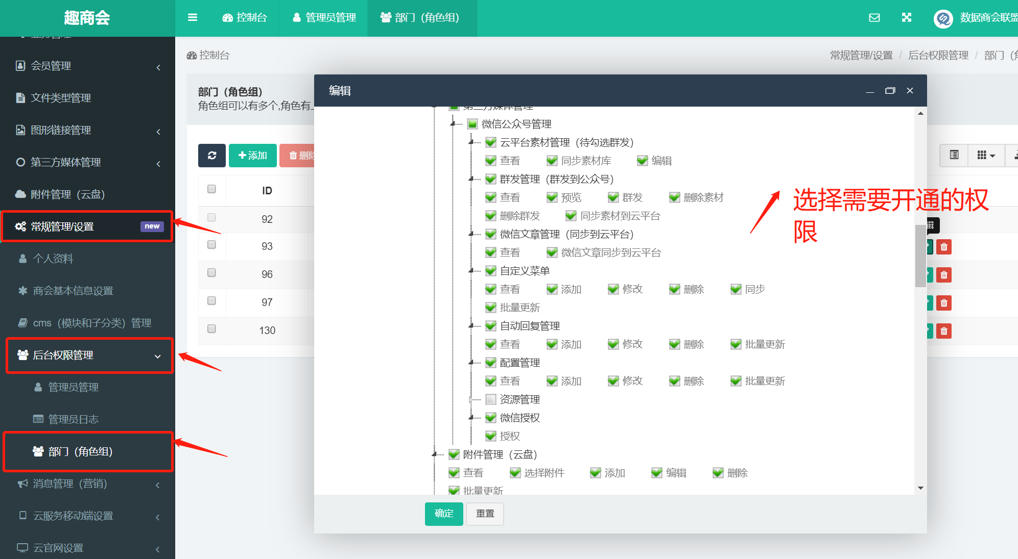 登录进去选择【常规管理/设置】--【后台权限管理】-【部门(角色组)】 在对话页面里,方框里打钩即为选中,表示该部门有该权限。 人员的权限按照所属的部门权限,需要在部门里添加管理人员和设置初始密码